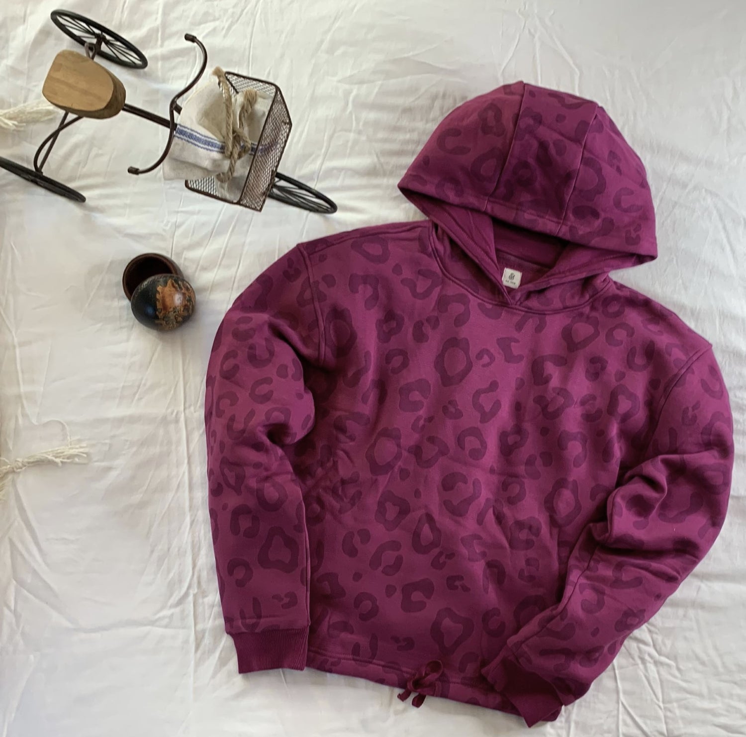 A cozy and stylish cropped hoodie featuring a magenta color with a leopard print. Being made from Egyptian cotton makes it soft as well as the perfect gift for any birthday or holiday event. Pair it with your favorite jeans or leggings for a chic and effortless look.